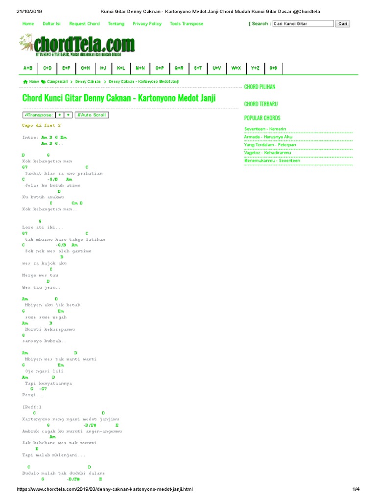 C Em Am G nyadari. Chord Genja SKA Kartonyono Medot Janji - Denny Caknan - SKA VersionIntroDm G C Am Dm G C Dm G C Am Dm G C C kok kebangeten men C F sambat blas ra ono perhatian Dm jelas ku butuh atimu G ku butuh awakmu F Fm G kok kebangeten men C loro ati iki C F tak mbarno karo tak nggo latihan Dm sok nek wes oleh gantimu G wes ra kajok aku F G mergo wes tau wes tau jeru Dm G mbiyen aku jek. Onde desde que foi publicado o Kartonyono Medot Janji Versi Indonesia Book foi muito procurado pelos fãs devido ao conteúdo de alta qualidade.