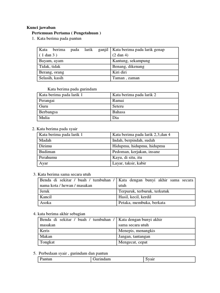 Nah untuk lebih gampang memahami ciri puisi rakyat ini dapat dilakukan dengan cara mendaftar kata berima pada gurindam syair dan pantun. Semoga kunci jawaban ini bisa membantu kalian yang belum menjawab Soal dan Kunci Jawaban Bahasa Indonesia Kelas 7 Kurikulum 2013 Revisi 2017 2. Rima Akhir Ganda Tak Sempurna Rima ganda tak sempurna adalah persamaan bunyi pada sebagian dua suku kata terakhir.
