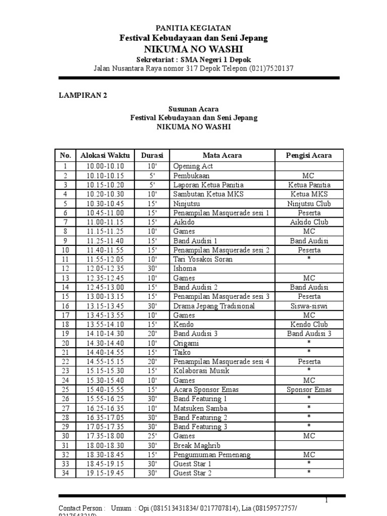 Susunan acara konser musik. Satu 1 Berkas Proposal Susunan Panitia Susunan acara Anggaran Biaya Demikian Surat Permohonan ini kami buat pertimbangan BapakIbu kami ucapkan terimakasih. Takutnya semangat persatuan dan kesatuannya hilang ujarnya. Puji syukur kehadirat Tuhan Yang Maha Esa karena pada kesempatan kali ini kami selaku panitia pelaksana Event Parade Band dan Bakti Sosial Senandung Kasih Untuk Rohingya dapat menyelesaikan proposal Event ini sesuai harapan.