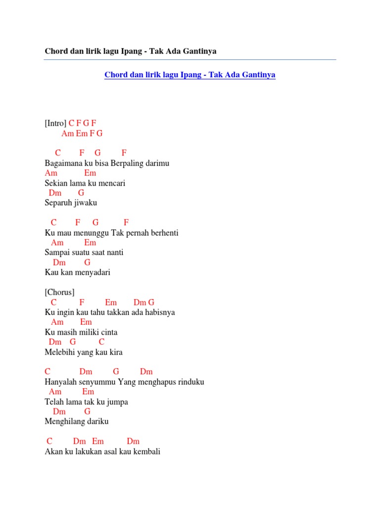 Ada yang harus kau mengerti D7 G C Kau takkan ada gantinya F Yang aku inginkan hanyalah dirimu Dm C bersamaku selamanya F Fm Bantu aku pergi dari G sepi yang ku rasa menyakitkan solo C Dm Em Dm Am Em F G chorus C F Ku ingin kau tahu Em Dm G Takkan ada habisnya Am Em. C F G F Bagaimana ku bisa Berpaling darimu Am Em Dm G Sekian lama ku mencari Separuh jiwaku C F G F Ku mau menunggu Tak pernah berhenti Am Em Dm G Sampai suatu saat nanti Kau kan menyadari. Lirik Lagu dan Kunci Gitar Chord Ipang - Tak Ada Gantinya OST Sepuluh Intro C F G F Am Em F G C F G F Bagaimana ku bisa Berpaling darimu Am Em Sekian lama ku mencari Dm G Separuh jiwaku C F G F Ku mau menunggu Tak pernah berhenti Am Em Sampai suatu saat nanti Dm G Kau kan menyadari Chorus C F Em Dm G Ku ingin kau tahu takkan ada habisnya.